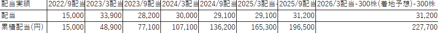 現在日本たばこ産業(JT)【2914】を旧NISAで300株保有していますので、配当金を31,200円(=300株×1株配当@104円)の受領となりました。2025年3月時点で今まで受け取った配当金は196,500円となりました。2026年3月時点予想で予想配当金累積額は227,700円となります。