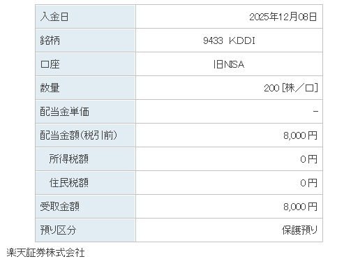 KDDI【9433】から配当金の入金。2026年12月8日入金分(旧NISA-200株保有)。追加投資を来年検討中。