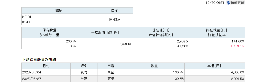 現在(2025年12月19日)時点で僕はKDDIを旧NISAで200株保有しています。