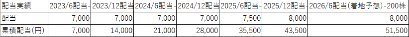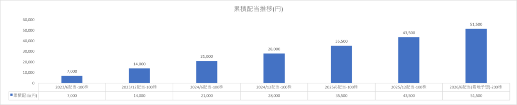 2026年6月には8,000円(=200株×1株40円)の配当金が入金予定で、累積の配当金は51,500円の予定となります。2025年6月18日の配当利回りは、2.95%、取得単価利回りは3.99%となります。