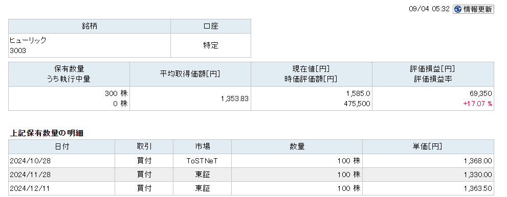 現在の持ち株のヒューリック【3003】の損益について共有したいと思います。