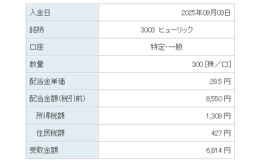 ヒューリック【3003】から配当金の入金のお知らせがありましたので