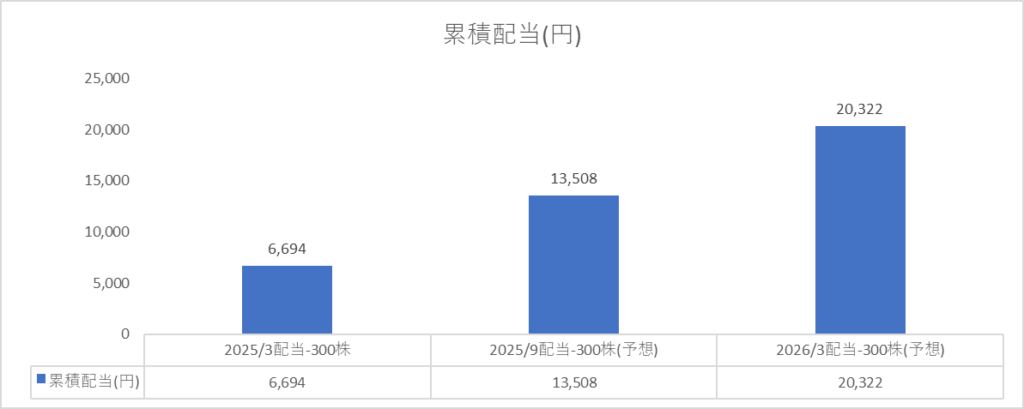 現在ヒューリック【3003】を特定口座で300株保有していますので、配当金を6,813円(=300株×1株配当@28.5円*20.315%)の受領となりました。2025年9月時点で今まで受け取った配当金は13,508円となりました。2026年3月時点予想で予想配当金累積額は20,322円となります。