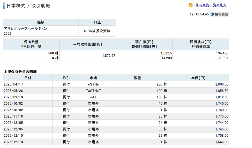 現在アサヒグループホールディングスを新NISAで560株、特定口座で100株保有しています。