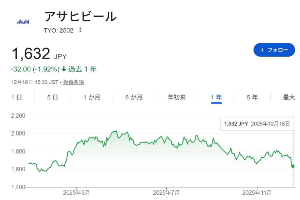 アサヒグループホールディングスに関しては今年に投資をしてから含み損が増えてきています。