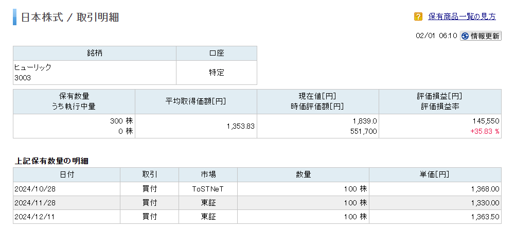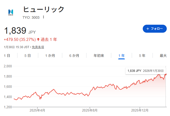 ヒューリック【3003】に2026年1月29日にNISAで100株投資を行いました。