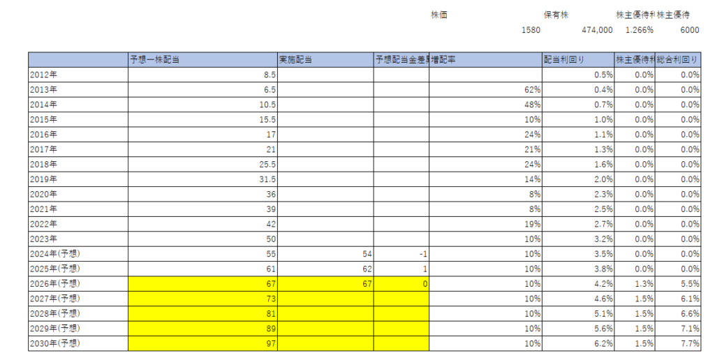 2024年から配当金の試算をしていって、1円配当金は少なかったですが、2025年は多く1円の配当金となっていて、2026年の配当金はこの前の増配で67円となりぴったり、試算と合致しました。