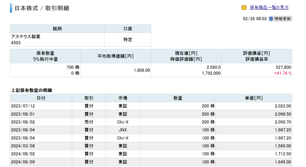 アステラス製薬へ100株追加投資を行いました2026年2月24日(1,300株保有)。着実に淡々と投資を行っていく。
