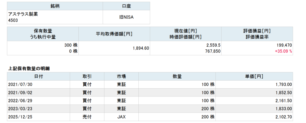 アステラス製薬に2026年2月24日にNISA100株追加投資を行い、特定口座で700株、旧NISAで300株、新NISAで300株合計1,300株となりました。