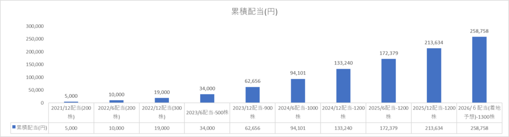 配当金は2026年6月に受け取り予想で+45,124円となり、累積配当が+258,758円の着地予想となっております。トータルリターンは含み益を合わせると+1,081,379円となります。