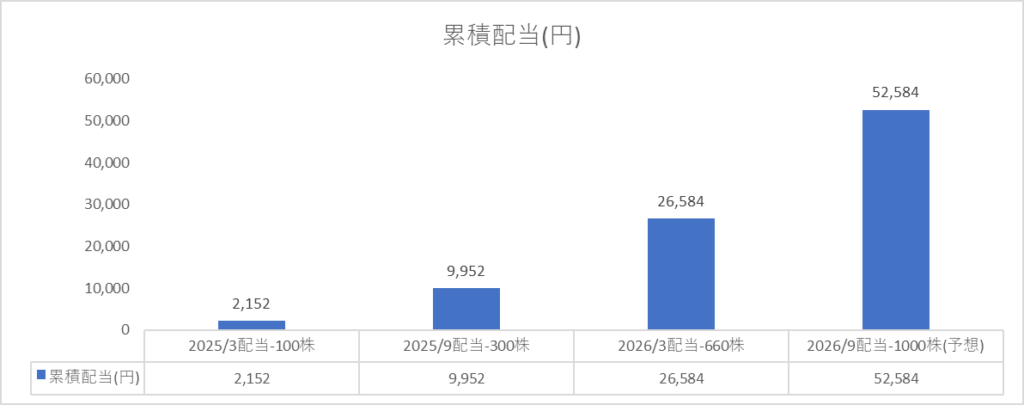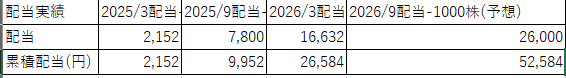 現在アサヒグループホールディングス【2502】をで660株保有していますので、配当金を16,632円の受領となりました。2026年3月時点で今まで受け取った配当金は26,584円となりました。2026年9月時点予想で予想配当金累積額は52,584円となります。