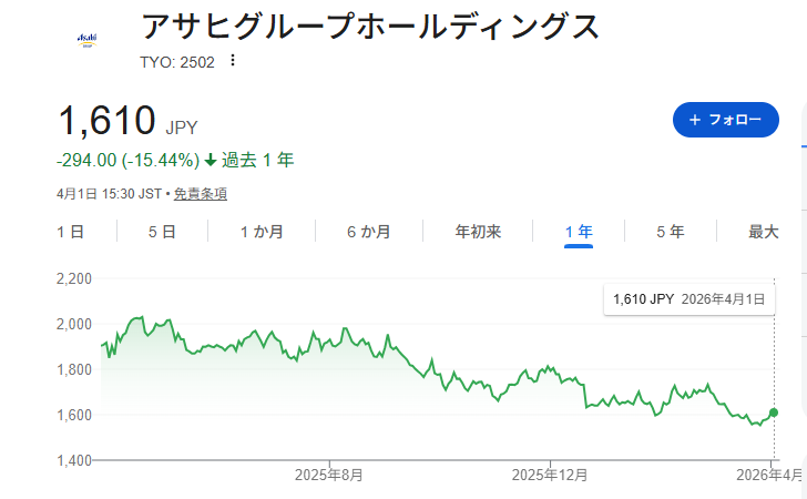 アサヒグループホールディングスに投資をしても、なかなか芽が出ずに2年たっても3年たってももしかしたら含み損も変わらずとか株価ももっと下がる可能性もあると思います。