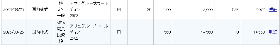 アサヒグループホールディングス【2502】から配当金の入金のお知らせがありましたので