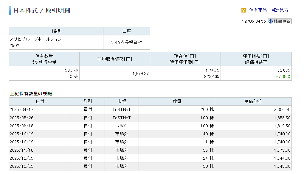 現在アサヒグループホールディングスを新NISAで530株保有しています。