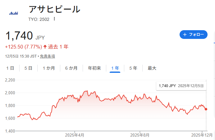 今回はアサヒグループホールディングス【2502】に追加で投資を行いました。