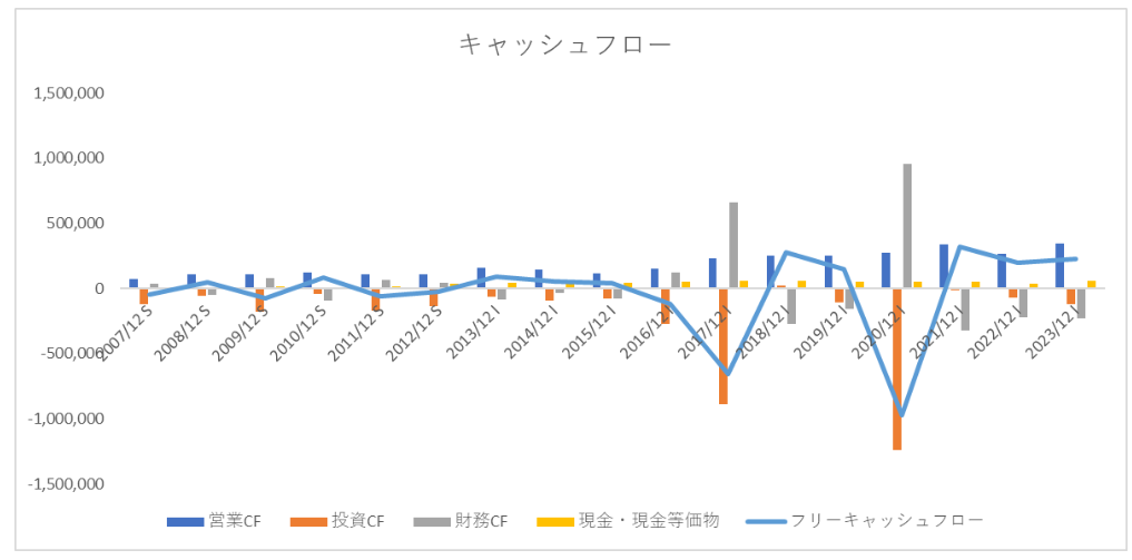 キャッシュフローに関しても2021年以降に営業キャッシュの改善がなされています。