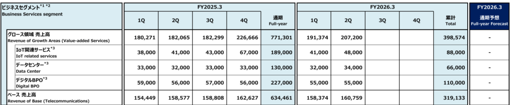 ビジネスセグメントの営業利益は1,187億円(前年同期比+3.4%)、IoTO関連サービス、データセンター事業は着実に売上は伸びていますがデジタルBPOは売上が伸びていません。