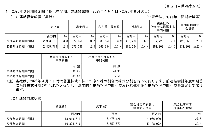 売上高は2兆9,631億円(対前年同期比3.8%増)-進捗率46.8%、営業利益は5,771億円(対前年0.7%増)-進捗率-49%、親会社の所有者に帰属する四半期利益は3,777億円(対前年比7.6%増)–進捗率-50.5%となり増収増益となりました。