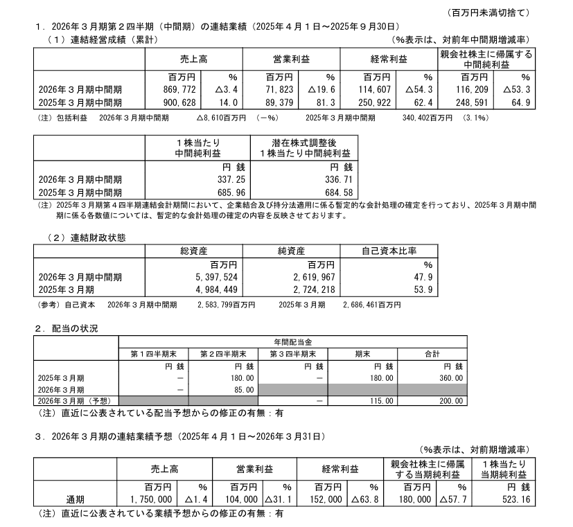 商船三井【9104】が2026年3月期2Q決算(4-9月)を発表しましたので記事にします。