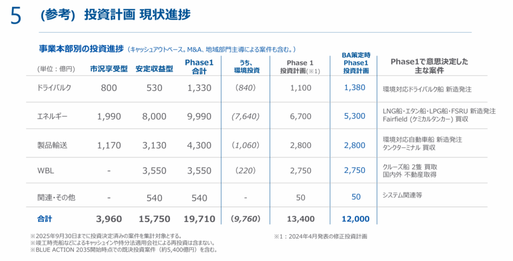 次の中期経営計画のPhase2(2026-2030年度)の株主還元方針でどう変化していくか、おそらく配当性向は40%になり、上振れたら自社株買いという感じかなと思います。それか海運事業がかなりボラティリティが高い事業を行っているので、利益に応じた配当ではなく資本に応じたDOEを採用する可能性も大いにあります。そう考えたときに、安心はできはしないですが、少し不安は減ると思います。