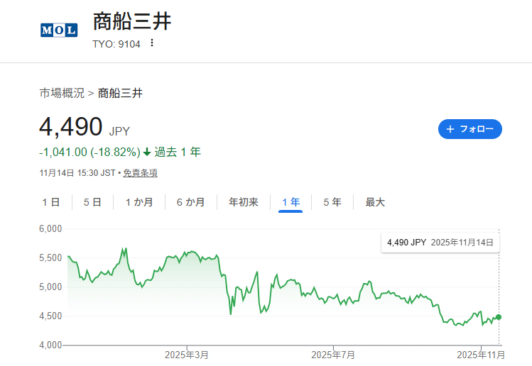 商船三井の株価は4,490円(2025.11.14)、PBRは0.60倍,PERは8.60倍です。