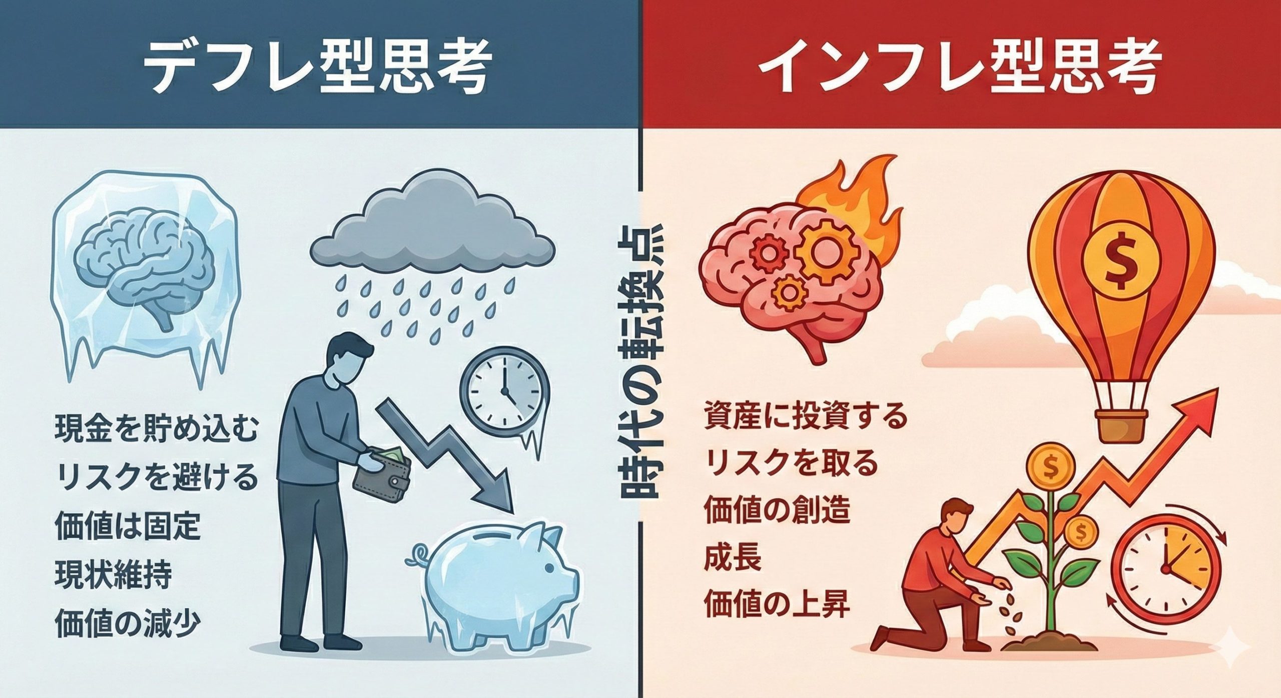 貯金型(デフレ)の思考から投資型(インフレ)の思考へ考え方を改めなければならないです。