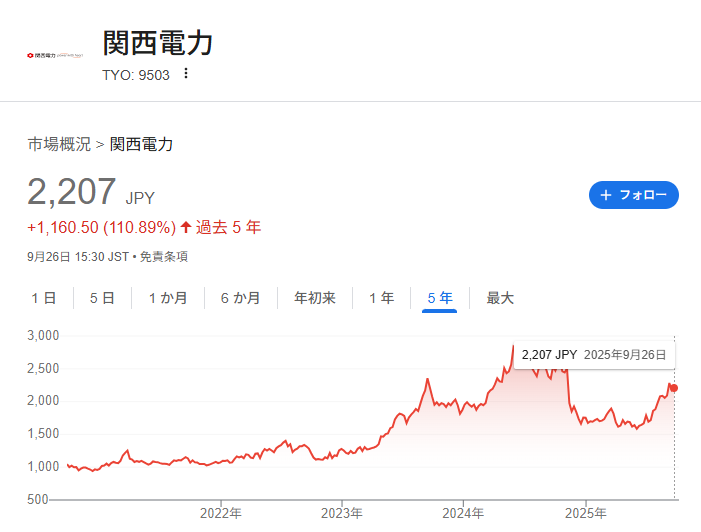 電力株で電源開発以外で意外と掘り出し物だなと思ったのは関西電力です。